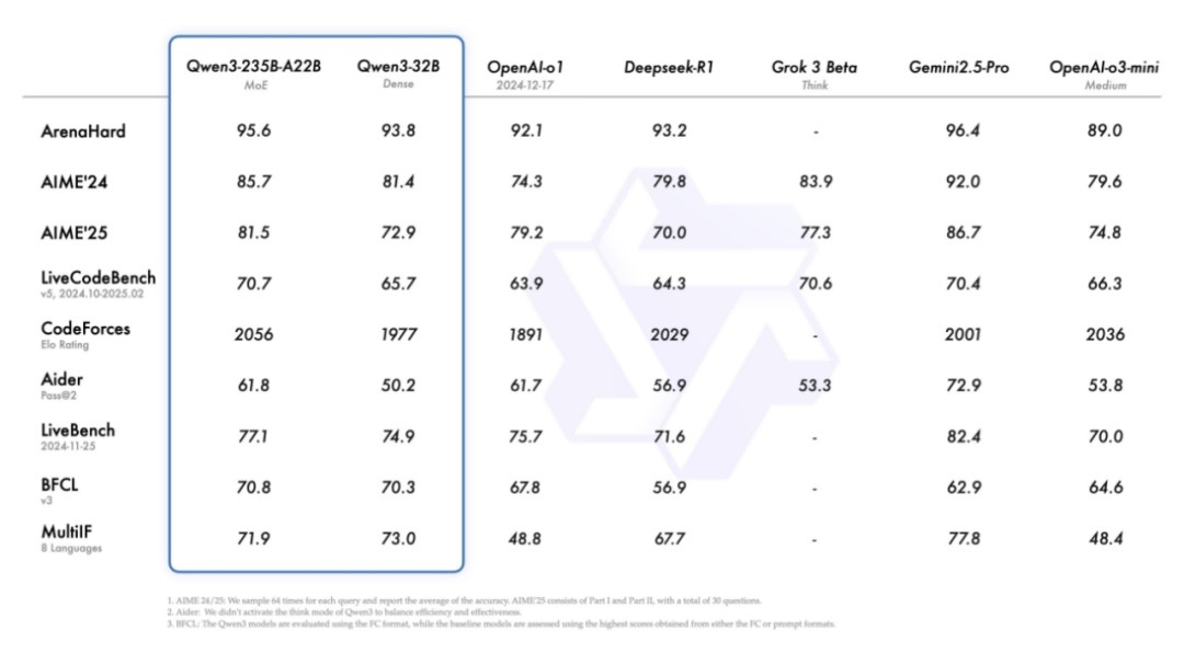在测试奥数水平的AIME25测评中,千问3斩获81.5分,刷新开源纪录;代码能力测试中,千问3 LiveCodeBench得分突破70分,超越Grok3;人类偏好对齐测评里,ArenaHard 95.6分的成绩更是超越OpenAI-o1及DeepSeek-R1。