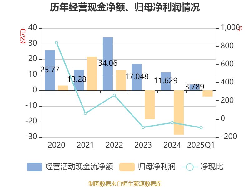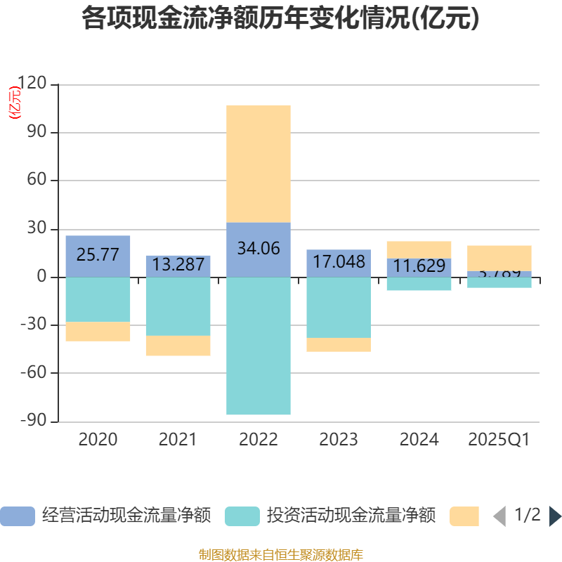 截至2025年一季度末,公司经营活动现金流净额为3.79亿元,同比增长52.9%;筹资活动现金流净额15.77亿元,同比增加4.86亿元;投资活动现金流净额-6.73亿元,上年同期为-9.25亿元。
